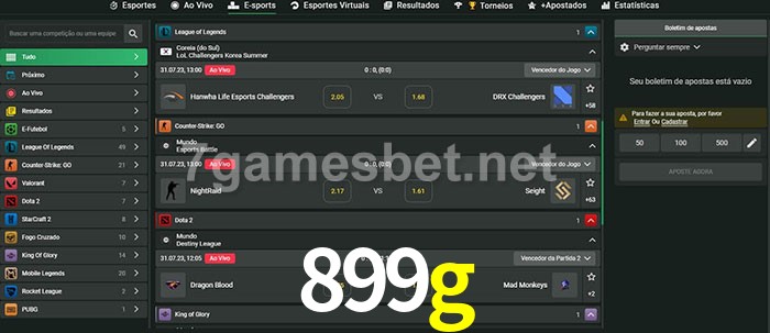 O 899g oferece uma grande seleção de opções de apostas em e-sports com probabilidades competitivas
